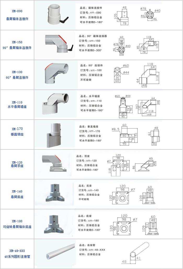 1.本系列懸臂組件配合鋁管,用于懸掛或支撐控制箱,采用陽極氧化表面處理、精巧美觀